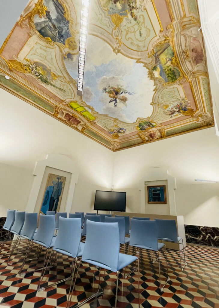 L’immobile, che ospitava una farmacia fino a 10 anni fa, è posto al piano terra con una superficie di 185 mq formata da 6 locali. Alcuni locali sono caratterizzati da soffitti con decorazioni pittoriche con quadrature architettoniche, decorazione floreali ed inserti di scene campestri di pregevole fattura e che rappresentano il fiore all’occhiello della nuova sede: alcune decorazioni sono state sottoposte a restauro dagli studenti del Centro di Formazione Professionale Scuola d’Arte ‘Andrea Fantoni’.