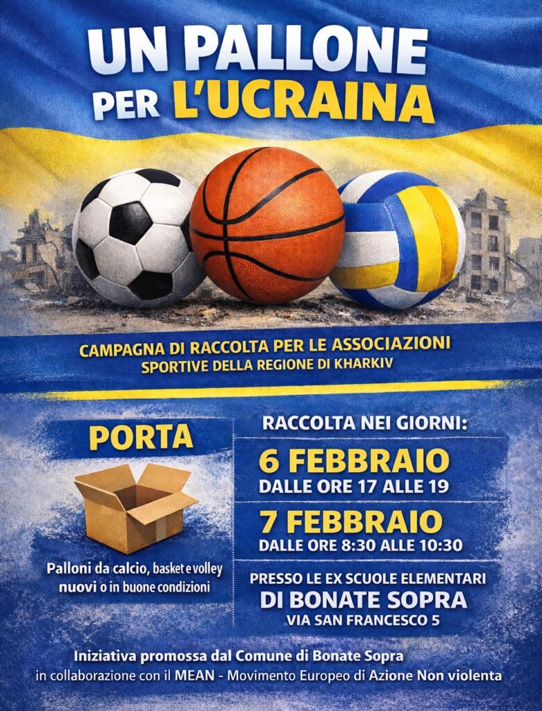 La solidarietà non si ferma. Dopo aver portato “luce” con la raccolta di candele e torce dello scorso inverno, Bonate Sopra scende nuovamente in campo (è proprio il caso di dirlo) per restituire ai giovani ucraini il diritto al gioco e alla normalità. Prende il via la campagna “Un pallone per l’Ucraina”, la seconda fase del progetto umanitario promosso dall’Amministrazione Comunale in collaborazione con il Mean (Movimento europeo di azione non violenta).