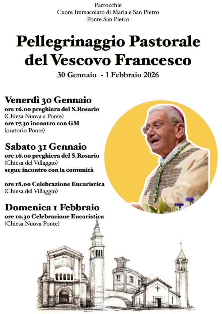 Si apre oggi, venerdì 30 gennaio, un weekend di grande importanza per la comunità di Ponte San Pietro. L’Unità Pastorale accoglie il Vescovo di Bergamo, monsignor Francesco Beschi, per la Visita Pastorale: tre giorni intensi tra celebrazioni eucaristiche, incontri con le associazioni e momenti civili significativi.