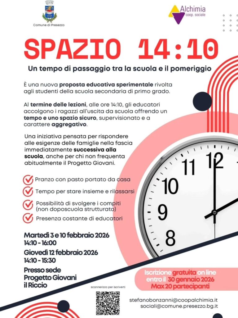 Nasce a Presezzo una nuova proposta educativa sperimentale per aiutare le famiglie a gestire il momento critico del post-scuola. Si chiama “Spazio 14:10” ed è un progetto promosso dal Comune in collaborazione con la Cooperativa Sociale Alchimia, rivolto agli studenti della scuola secondaria di primo grado.