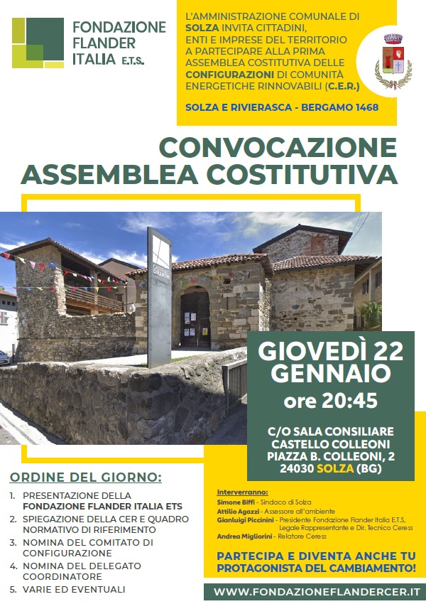 Al tavolo dei relatori siederanno il Sindaco di Solza, Simone Biffi, e l’Assessore all’Ambiente Attilio Agazzi, affiancati dagli esperti della Fondazione Flander, il presidente Gianluigi Piccinini e il relatore Andrea Migliorini, chiamati a sciogliere i dubbi tecnici e illustrare i vantaggi in bolletta per gli aderenti.