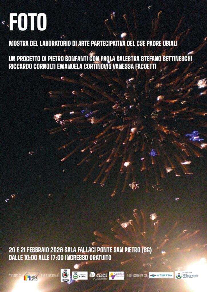 Sguardi inediti sul territorio, capaci di catturare dettagli che spesso sfuggono all’occhio distratto della quotidianità. Si intitola semplicemente “FOTO” la mostra che si terrà venerdì 20 e sabato 21 febbraio nella Sala Fallaci di Ponte San Pietro (via Giuseppe Garibaldi). L’esposizione, visitabile gratuitamente dalle 10 alle 17, raccoglie il frutto di un anno di lavoro del laboratorio di Arte Partecipativa del CSE – Centro Socio Educativo “Padre Ubiali” di Mozzo.