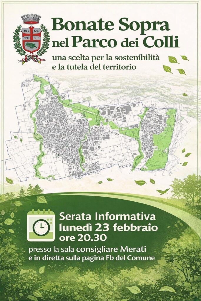 È una serata che potrebbe segnare il futuro urbanistico e ambientale di Bonate Sopra. Questa sera, lunedì 23 febbraio alle ore 20.30, l’Amministrazione comunale presenterà ufficialmente alla cittadinanza la volontà di entrare a far parte del Parco dei Colli di Bergamo. L’appuntamento è fissato presso la Sala Consigliare “Merati”, con possibilità di seguire l’evento anche in diretta streaming sulla pagina Facebook del Comune.
