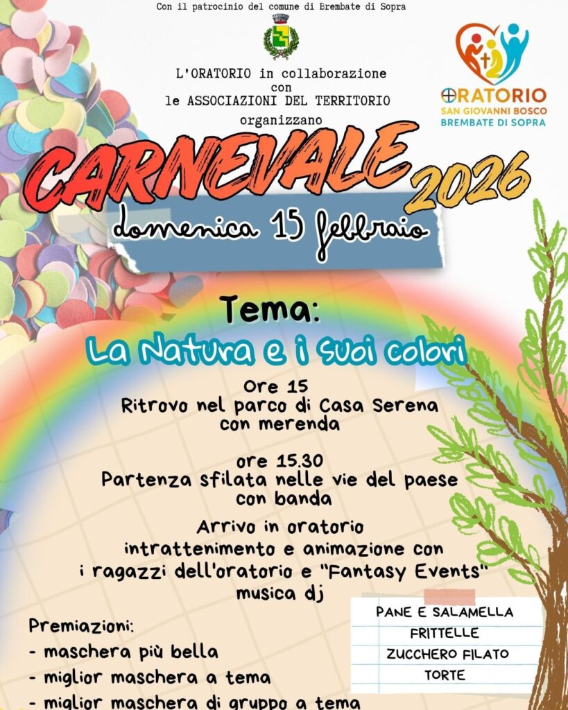 L’Oratorio San Giovanni Bosco celebra “La Natura e i suoi colori”. Domenica 15 febbraio il ritrovo è alle 15:00 al parco di Casa Serena; da lì partirà il corteo accompagnato dalla banda. In oratorio prevista musica con DJ, animazione “Fantasy Events” e premi per le maschere più belle.