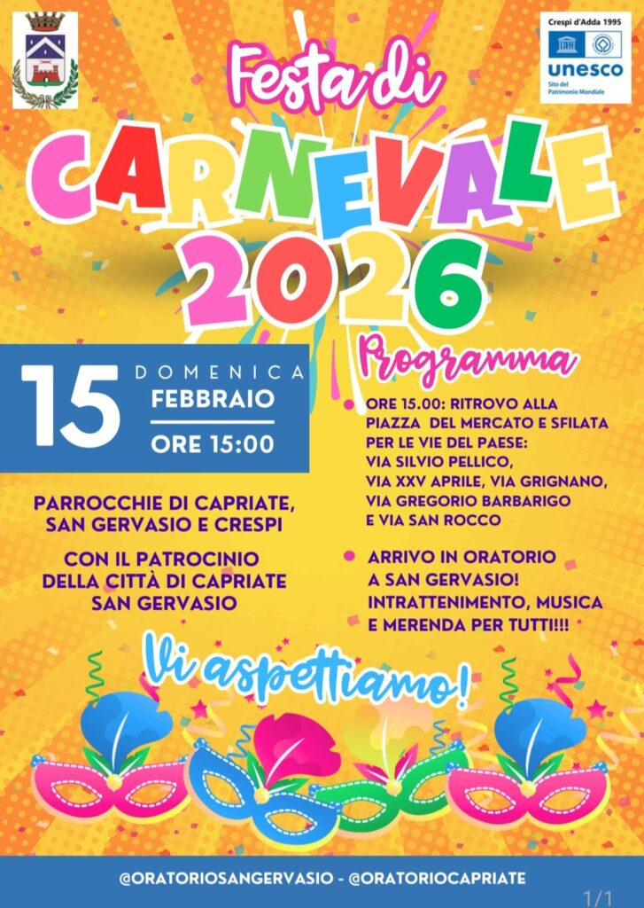 Festa congiunta per le parrocchie di Capriate, San Gervasio e Crespi. Domenica 15 febbraio alle 15:00 si parte da Piazza del Mercato per sfilare lungo le vie cittadine fino all’oratorio di San Gervasio, dove ci saranno musica, intrattenimento e merenda per tutti.