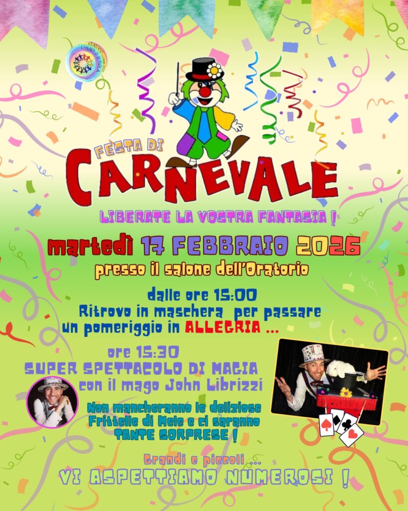 A Chignolo si festeggia il Martedì Grasso, il 17 febbraio. Ritrovo in maschera alle 15:00 presso il salone dell’Oratorio per un pomeriggio di allegria che culminerà, alle 15:30, con il “Super Spettacolo di Magia” del Mago John Librizzi e deliziose frittelle di mele.
