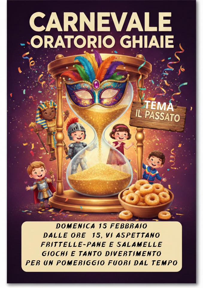 Un Carnevale a tema storico attende la frazione di Ghiaie domenica 15 febbraio. Dalle ore 15:00 l’oratorio propone un “pomeriggio fuori dal tempo” dedicato al tema “Il Passato”: tra giochi e divertimento non mancheranno pane, salamella e frittelle.