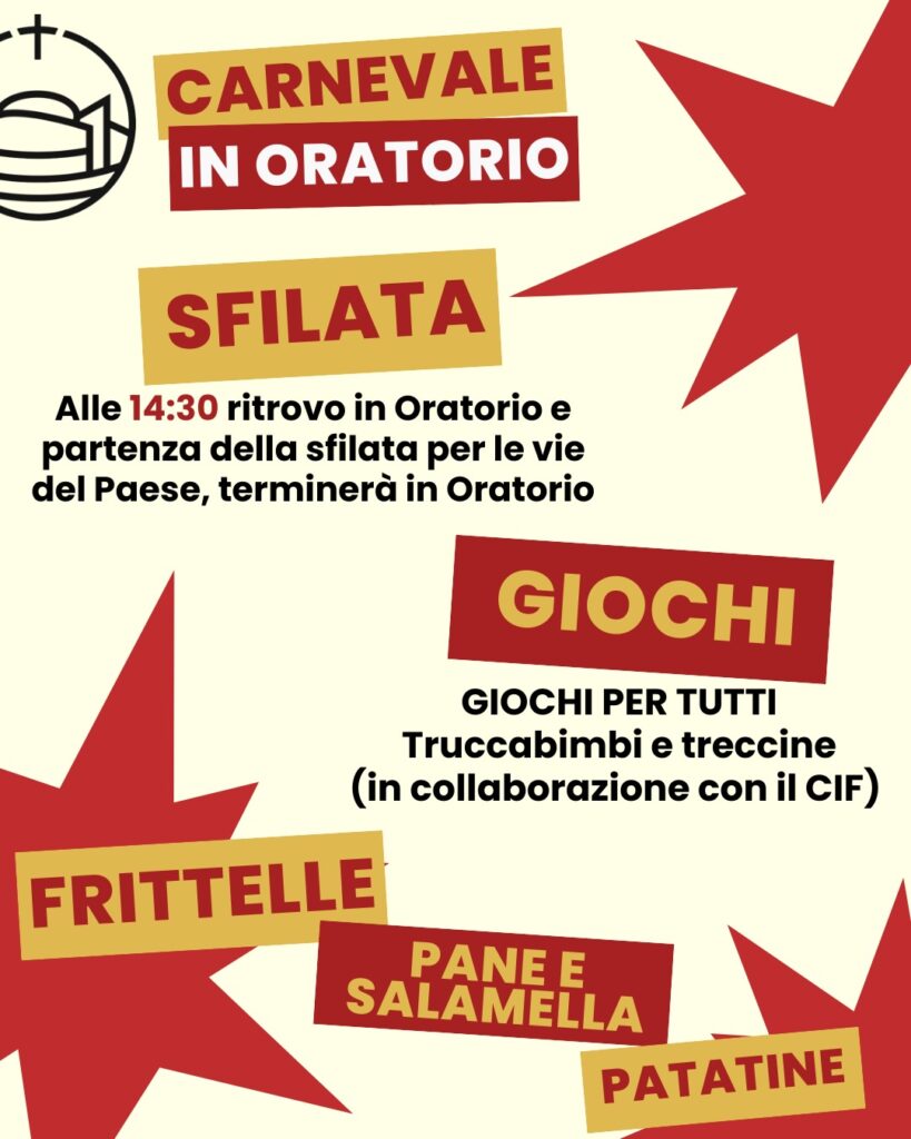 Domenica 15 febbraio l’appuntamento è alle 14:30 in Oratorio per la partenza della sfilata che attraverserà il paese. Al rientro, giochi per tutti e postazione truccabimbi e treccine in collaborazione con il CIF, accompagnati da patatine e salamelle.