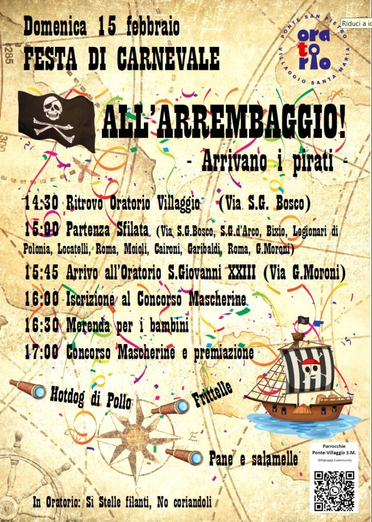 Domenica 15 febbraio i pirati invadono Ponte San Pietro con il tema “All’arrembaggio!”. La sfilata parte alle 15:00 dall’Oratorio del Villaggio e arriva all’Oratorio San Giovanni XXIII per il concorso delle mascherine. Attenzione alle regole di bordo: sì alle stelle filanti, ma niente coriandoli!