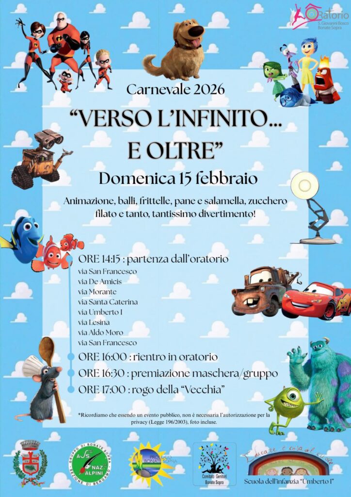 Un Carnevale spaziale quello di domenica 15 febbraio, ispirato al motto “Verso l’infinito… e oltre”. Dopo la sfilata che partirà alle 14:15, il pomeriggio proseguirà in oratorio con le premiazioni e, alle ore 17:00, il tradizionale e suggestivo “rogo della Vecchia”.