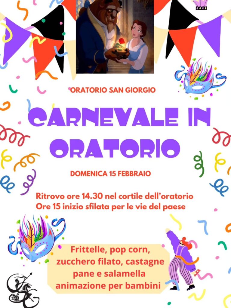 L’Oratorio San Giorgio organizza una grande festa per domenica 15 febbraio. Il ritrovo è fissato per le 14:30 nel cortile dell’oratorio, da cui partirà la sfilata per le vie del paese. Al termine, animazione per bambini e una ricca merenda con frittelle, zucchero filato e le tradizionali castagne.