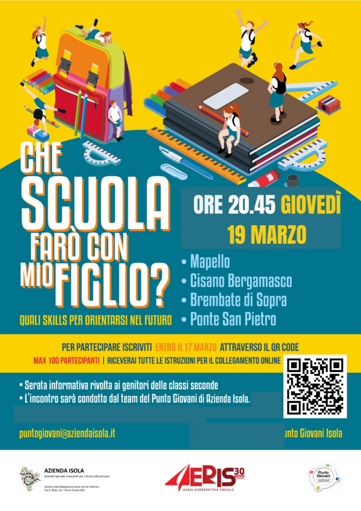 L’evento, in programma per giovedì 19 marzo alle ore 20:45, è rivolto specificatamente ai genitori degli studenti delle classi seconde dei comuni di Mapello, Cisano Bergamasco, Brembate di Sopra e Ponte San Pietro. La serata sarà condotta dal team del Punto Giovani di Azienda Isola (in collaborazione con Aeris Cooperativa Sociale) e offrirà spunti e strumenti concreti per aiutare i ragazzi a orientarsi in modo consapevole verso il proprio futuro scolastico.