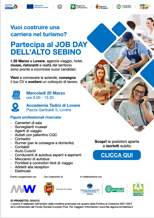 L’evento odierno si inserisce nella fortunata rassegna promossa dal “Patto territoriale per le competenze e l’occupazione nella filiera del Turismo”, una misura regionale cofinanziata dal Fondo Sociale Europeo Plus e coerente con il programma GOL del PNRR. Questo Job Day dedicato all’Alto Sebino e al Lago d’Iseo arriva dopo i grandi successi delle edizioni precedenti, dal “Job Day Summer” ai vari Career Day sparsi tra la Val Seriana, Treviglio, la Valle Brembana e la Valle Imagna. L’iniziativa di oggi è promossa dalla Provincia insieme all’agenzia MAW, con il patrocinio del Comune di Lovere e la collaborazione di Confcommercio, Confesercenti e Coldiretti.