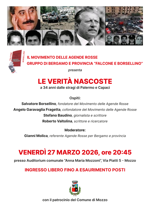 A 34 anni dalle tragiche stragi di Capaci e via D’Amelio, il territorio bergamasco si prepara a un importante momento di riflessione e memoria. Venerdì 27 marzo, alle ore 20.45, l’Auditorium “A.M. Mozzoni” di Mozzo ospiterà l’incontro intitolato “Le verità nascoste“, organizzato dal Movimento delle Agende Rosse Gruppo di Bergamo e provincia “Falcone e Borsellino”, con il patrocinio del Comune.