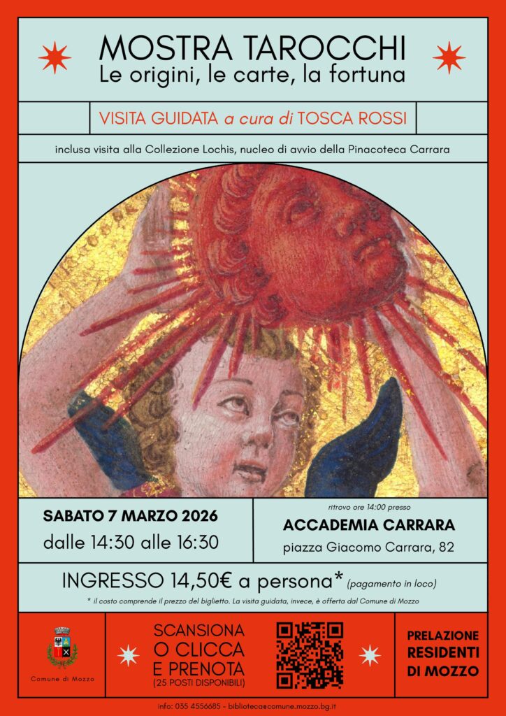 La Biblioteca comunale “Sandro Pertini” di Mozzo organizza una visita guidata alla mostra “Tarocchi. Le origini, le carte, la fortuna” all’Accademia Carrara di Bergamo. L’appuntamento è per sabato 7 marzo, dalle 14.30 alle 16.30, con guida Tosca Rossi.