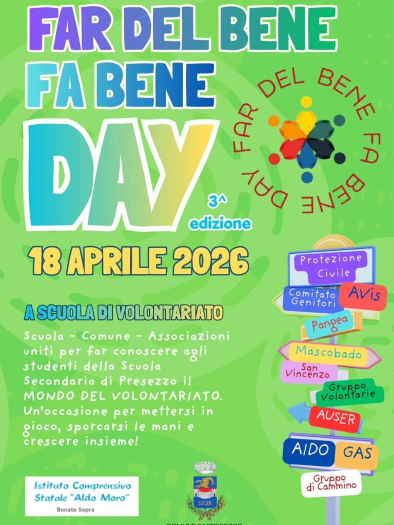 Sabato 18 aprile 2026 le vie di Presezzo ospiteranno la terza edizione del “Far del bene fa bene Day”, un’iniziativa dedicata alla solidarietà che vede protagonisti gli studenti della Scuola Secondaria dell’Istituto Comprensivo “Aldo Moro”. Insieme a professori e genitori, i ragazzi lasceranno i banchi per collaborare attivamente con le associazioni locali in attività pratiche, scoprendo da vicino il valore dell’impegno civile e della cittadinanza attiva nel cuore del proprio territorio.