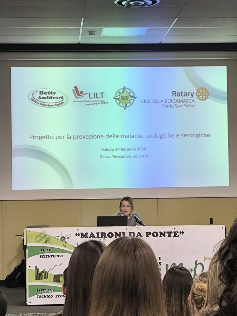 Sabato 14 febbraio 2026 circa cinquecento alunni delle classi quinte dei due Istituti di scuola superiore di Presezzo hanno assistito all’eccellente conferenza messa a disposizione del Rotary Club Isola Bergamasca-Ponte San Pietro e tutti sono stati invitati a richiedere il gratuito screening di prevenzione che verrà effettuato durante l’orario scolastico direttamente nell’infermeria della scuola, in forma totalmente gratuita sia per i ragazzi che le ragazze perché offerta dal Rotary Club.